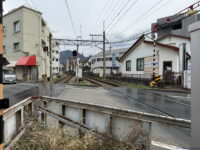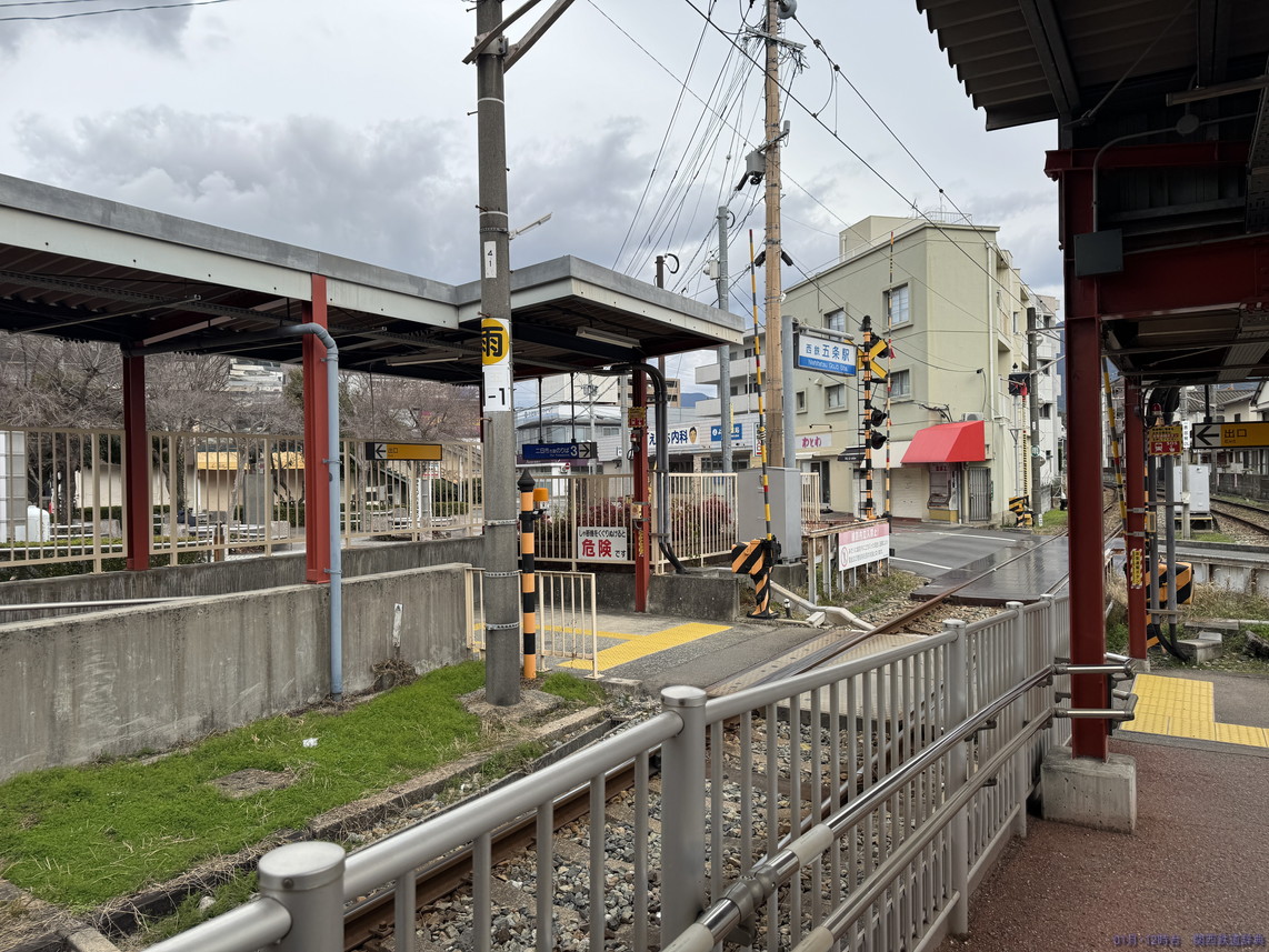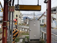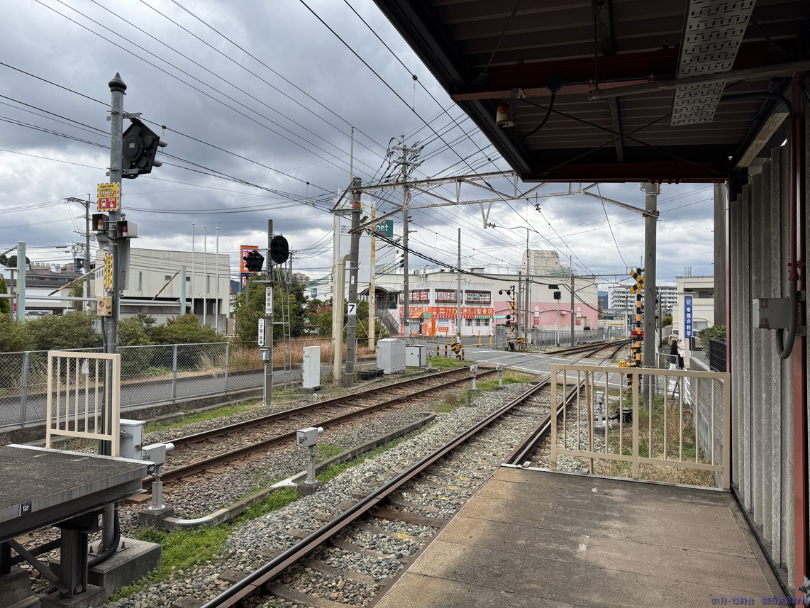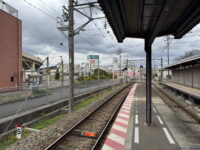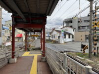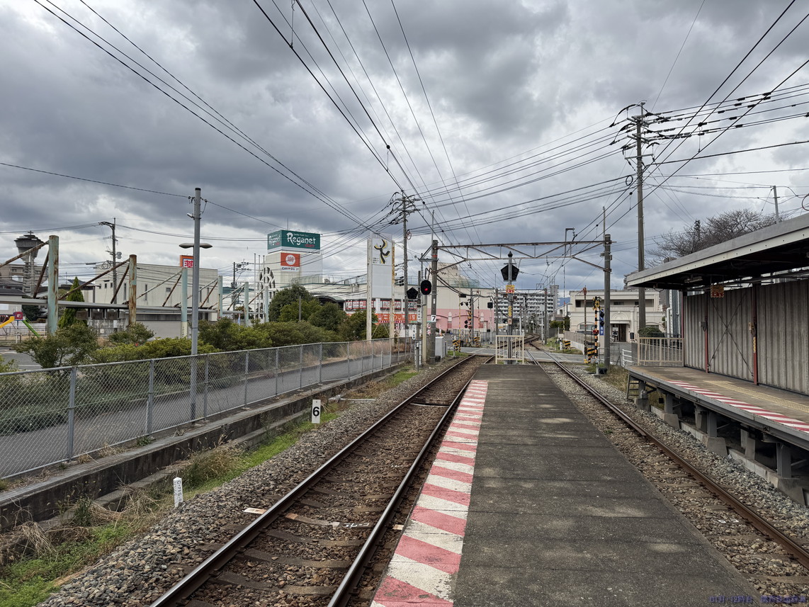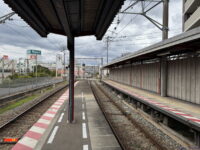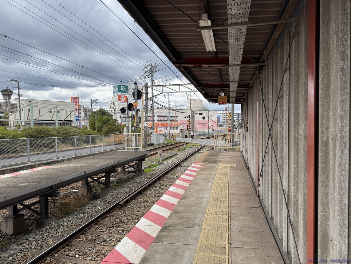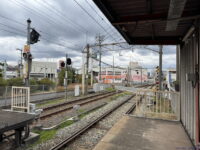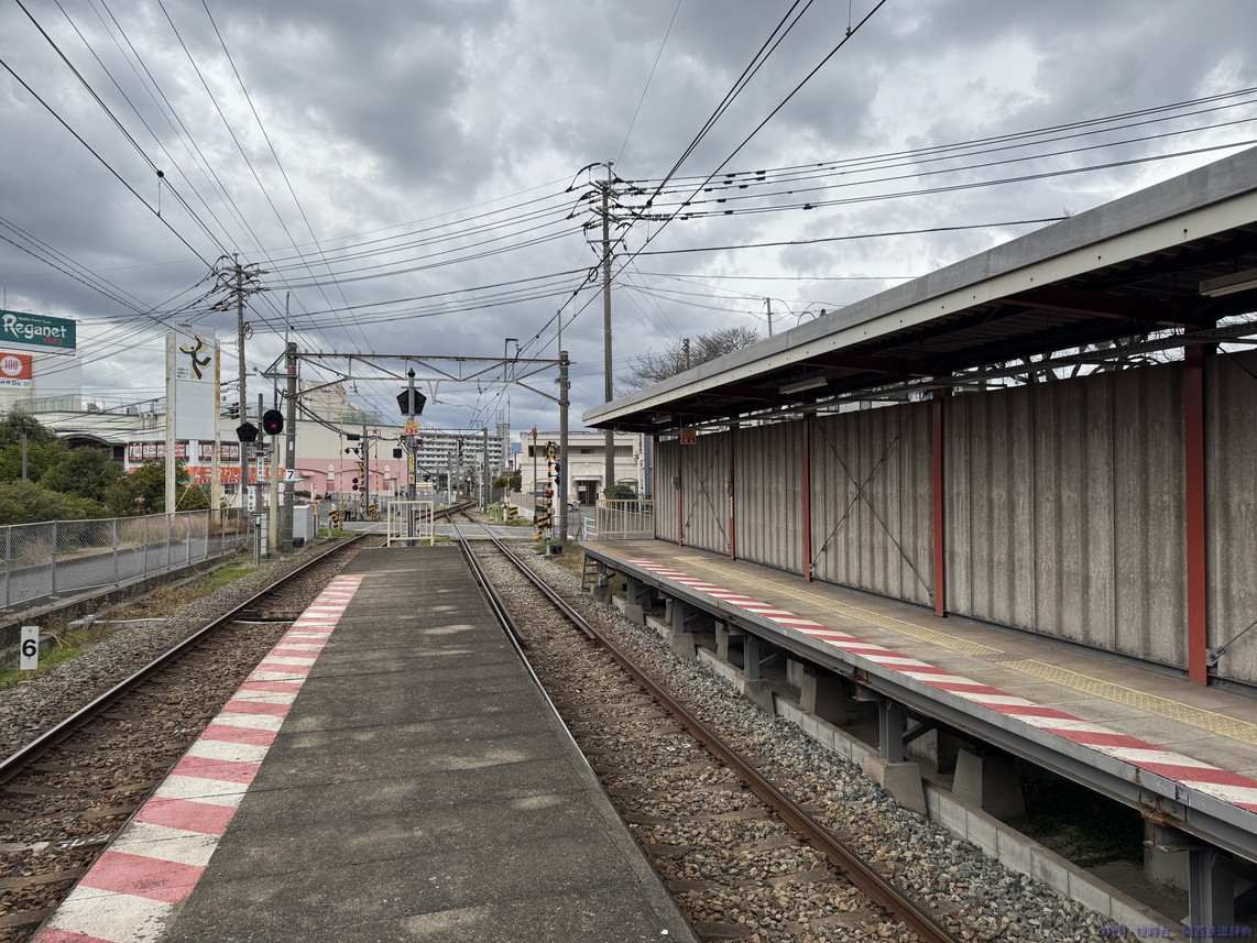 ということで、島式ホーム側、構内踏切の横から。駅のとなりに踏切があり、上下線間に機器箱があって被ります。