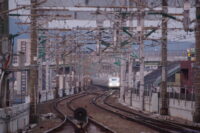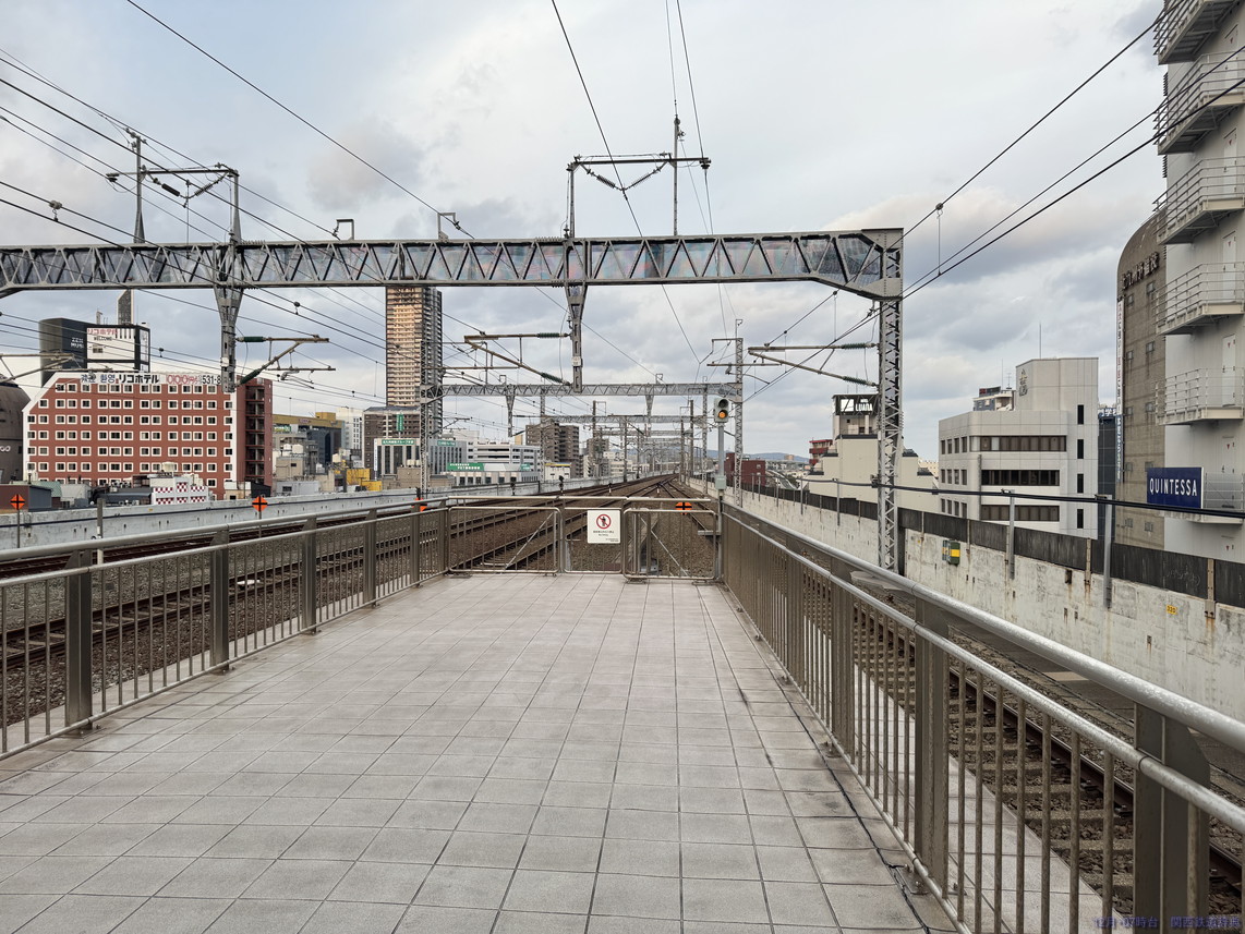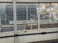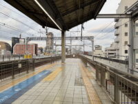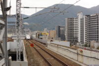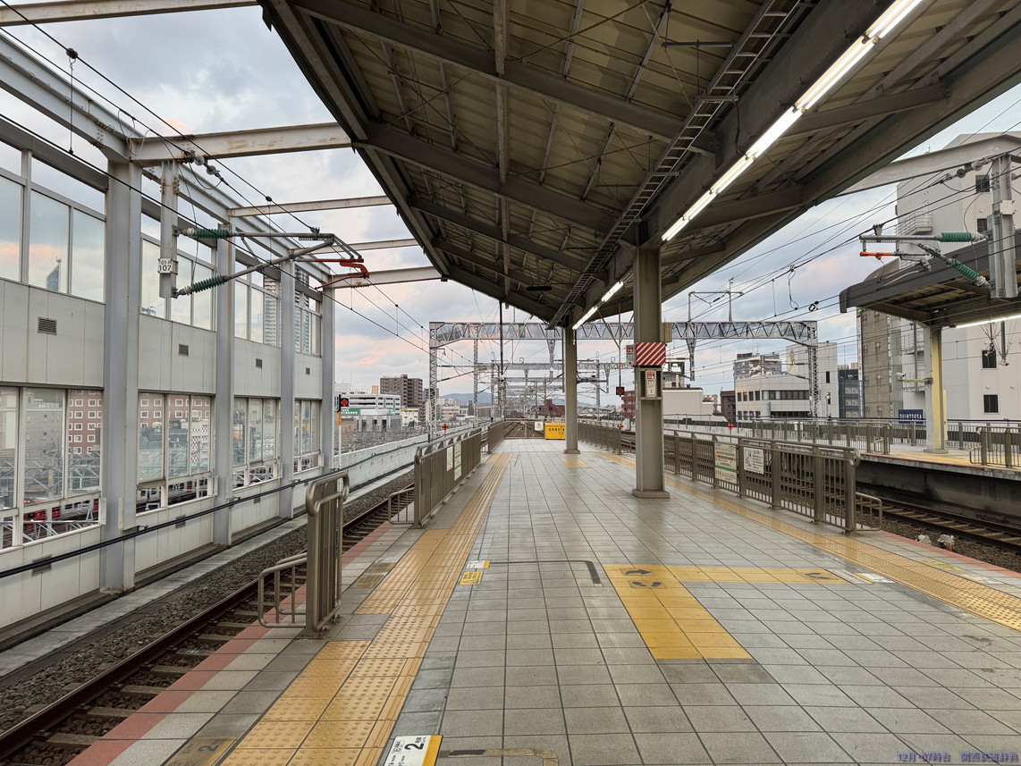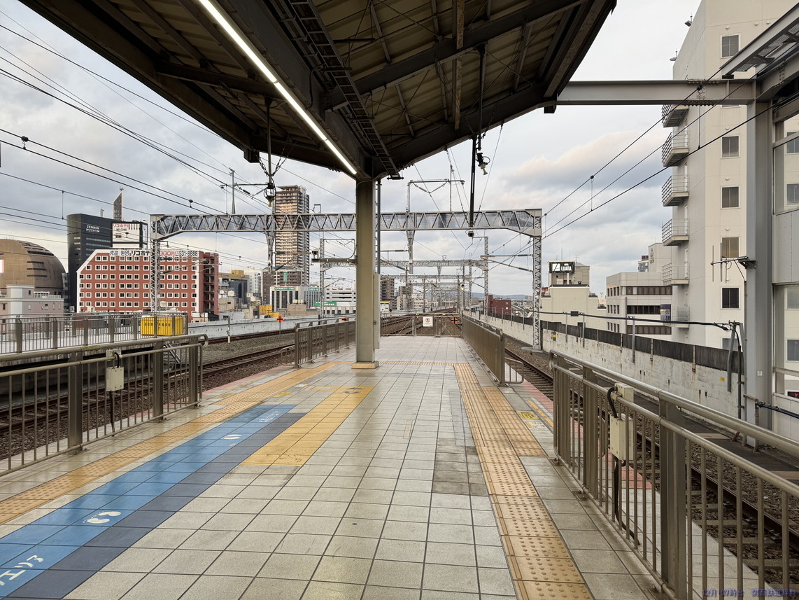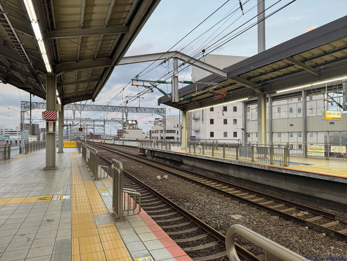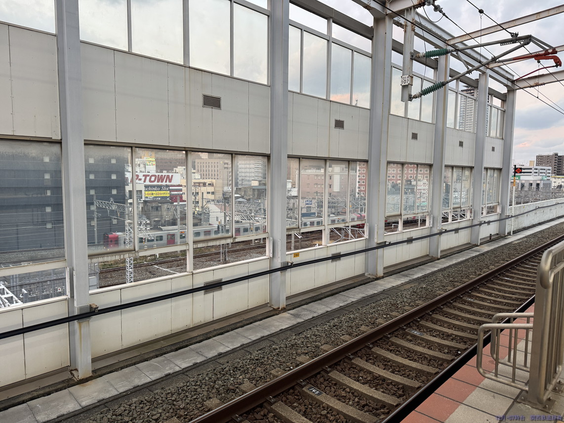 下りホーム下り方からの上り列車。東西に伸びる在来線の線路の北側に並べてつけたためか、下り副本線が概ね直線的で、下り本線・上り本線・上り副本線となるにつれて北側に膨らむ感じです。