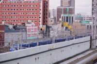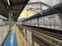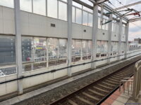 上りホームから上り列車の撮影です。先述の「膨らみ」でゆるいカーブがよくわかります。黄線内から望遠で。