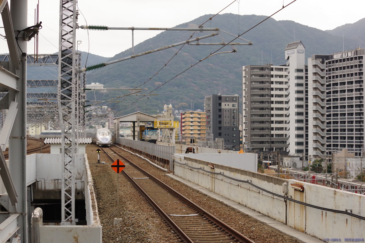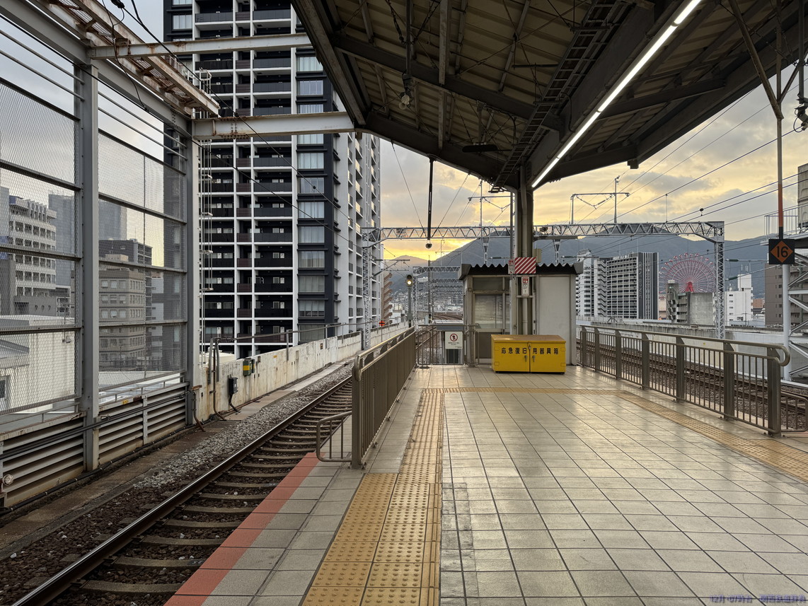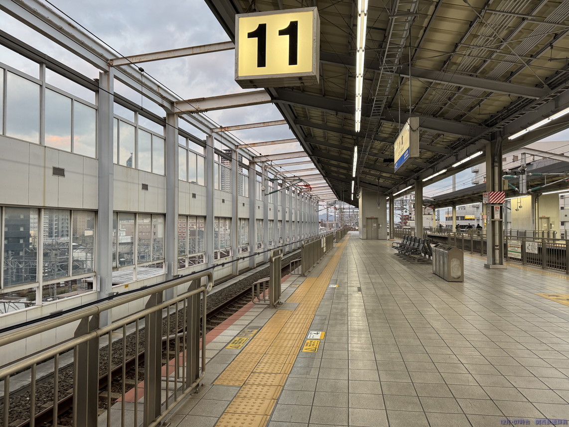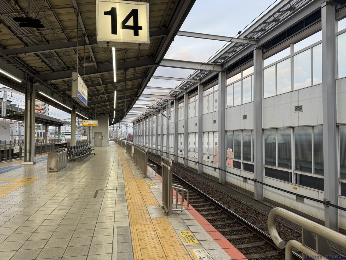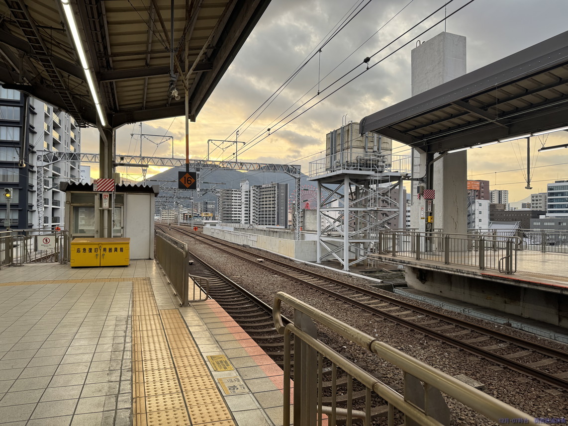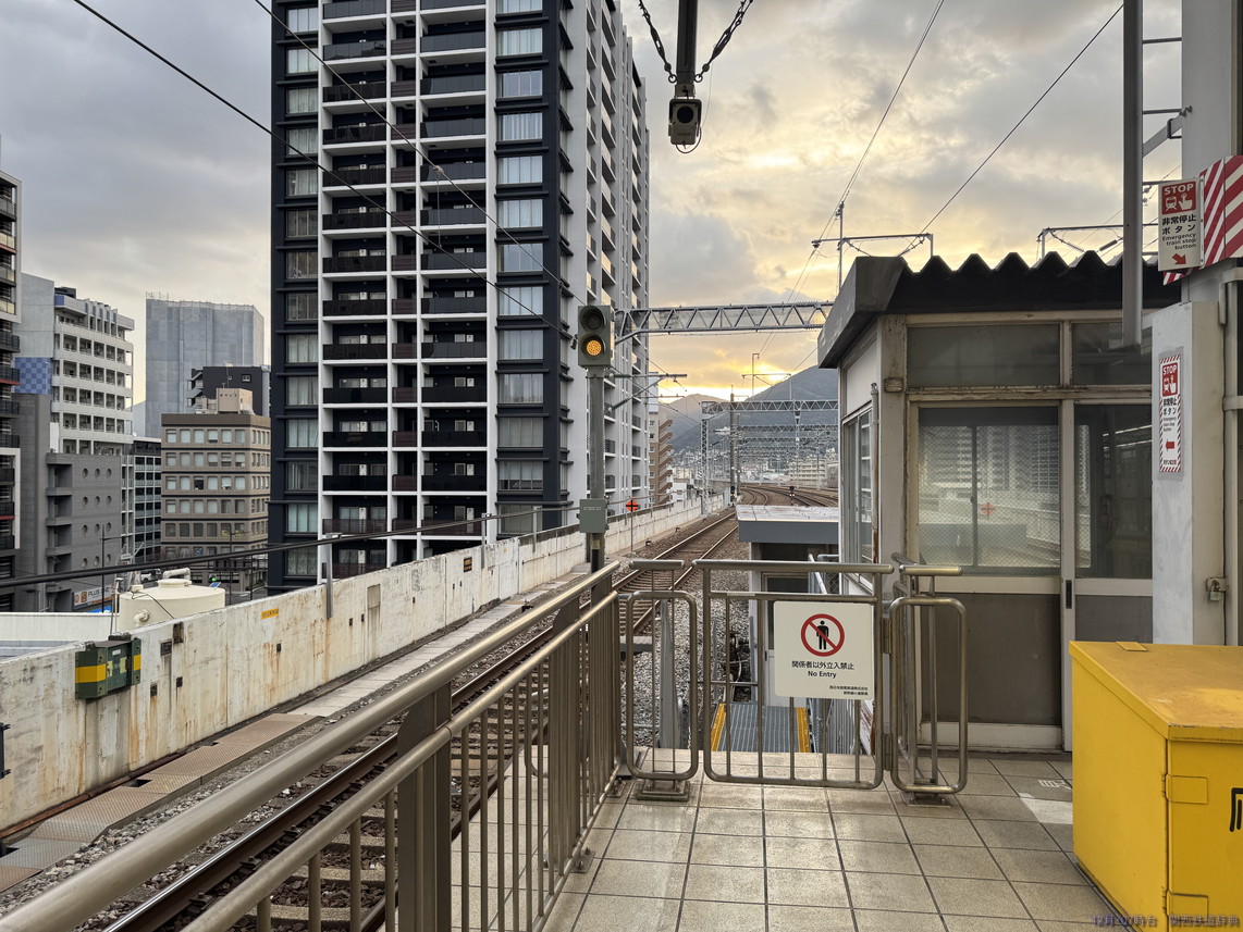 上りホームからの下り列車撮影。上り方は新関門トンネルに向かうため、逆サイドよりも大きなカーブになっています。またホーム端は詰所で先が見えず。ただホームがカーブしているので、15-14号車付近であれば、12番線に入る8両編成なら望遠でなんとか。ただ300mmではホーム柵をかわしきれず、少し入ってしまっています。