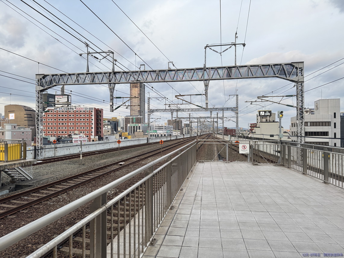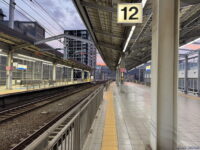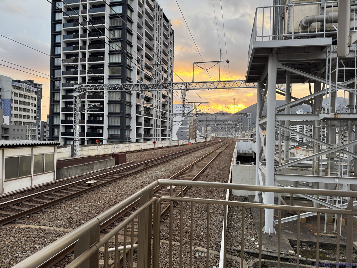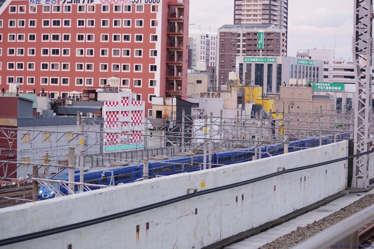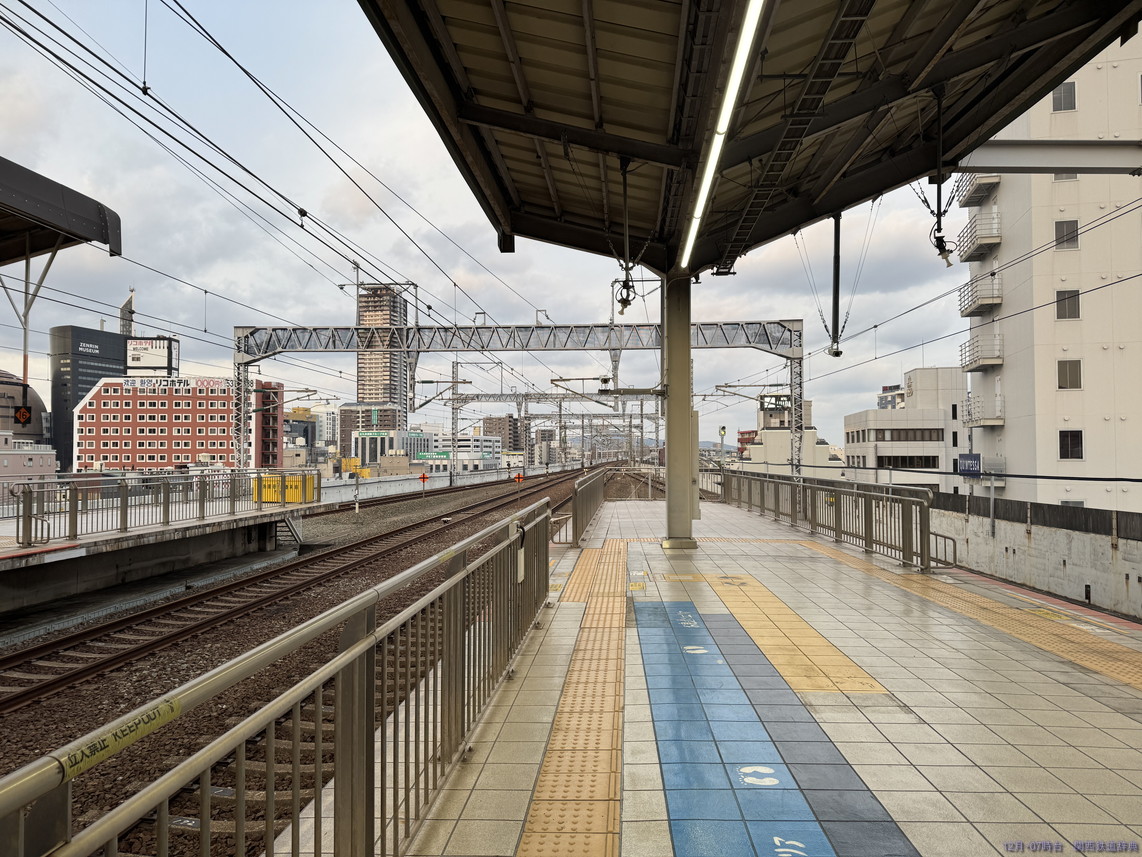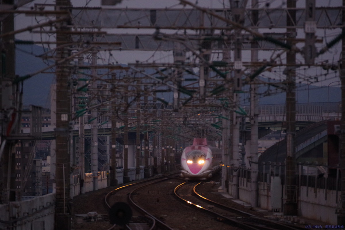 上りホームからの下り列車撮影。上り方は新関門トンネルに向かうため、逆サイドよりも大きなカーブになっています。またホーム端は詰所で先が見えず。ただホームがカーブしているので、15-14号車付近であれば、12番線に入る8両編成なら望遠でなんとか。ただ300mmではホーム柵をかわしきれず、少し入ってしまっています。