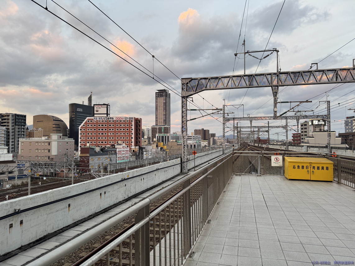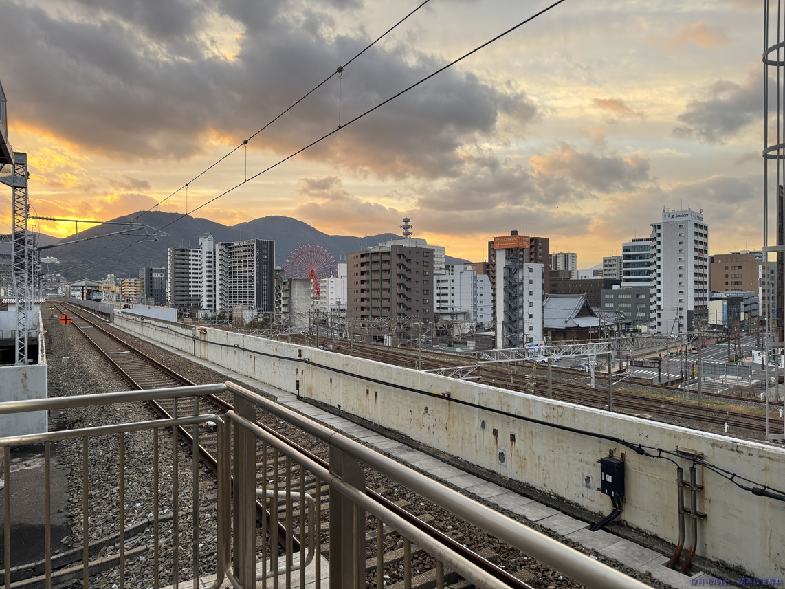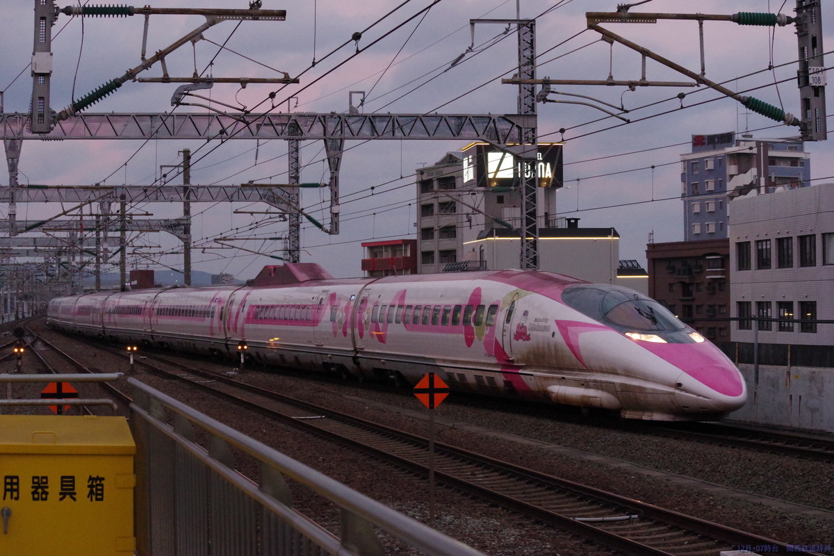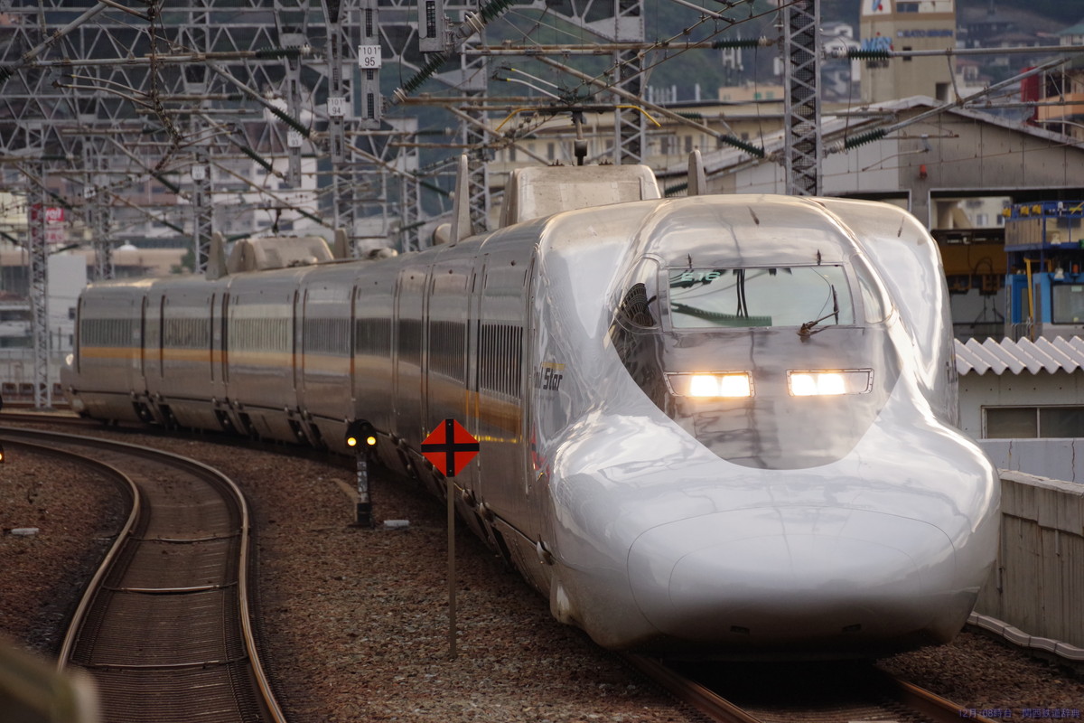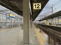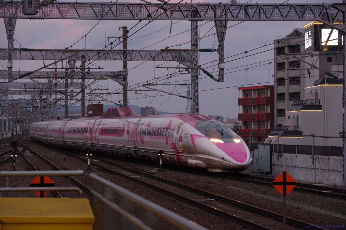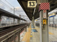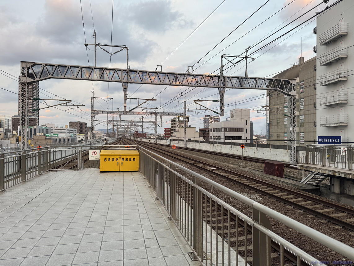 上りホームからの下り列車撮影。上り方は新関門トンネルに向かうため、逆サイドよりも大きなカーブになっています。またホーム端は詰所で先が見えず。ただホームがカーブしているので、15-14号車付近であれば、12番線に入る8両編成なら望遠でなんとか。ただ300mmではホーム柵をかわしきれず、少し入ってしまっています。