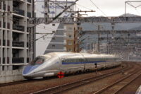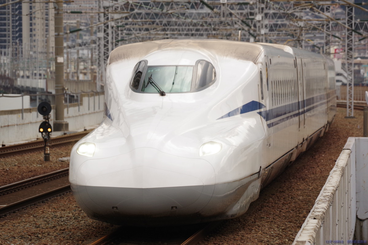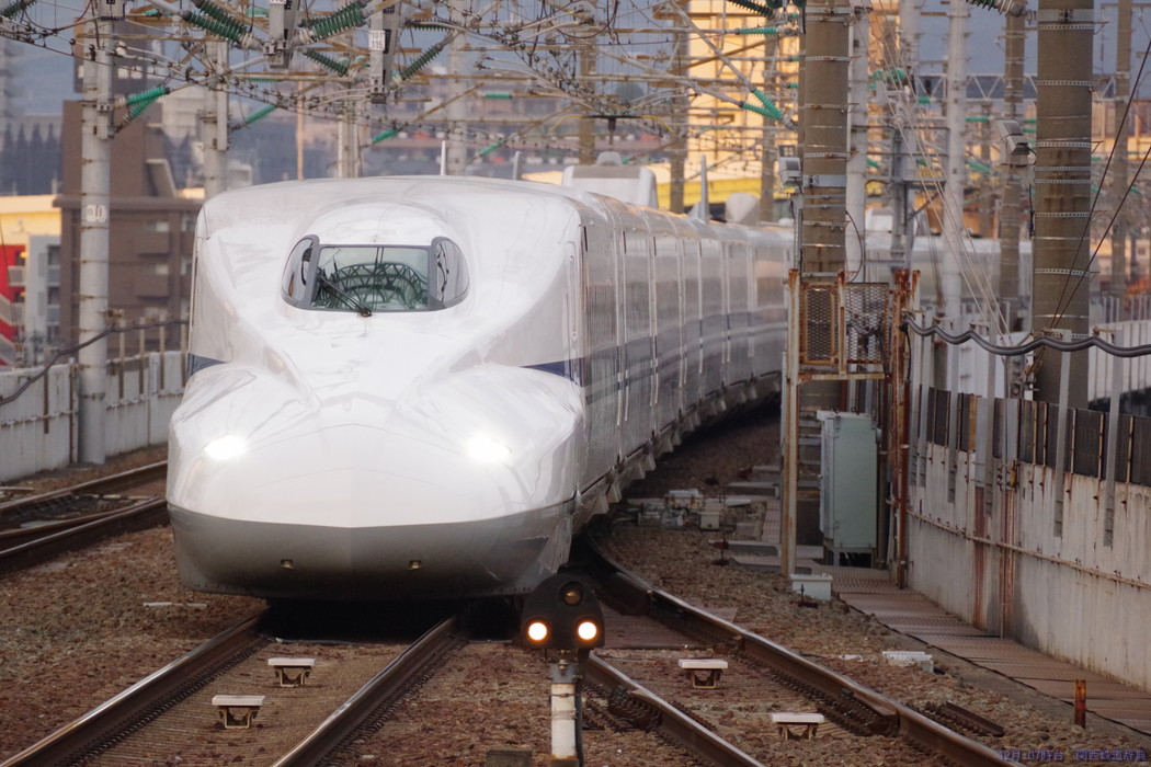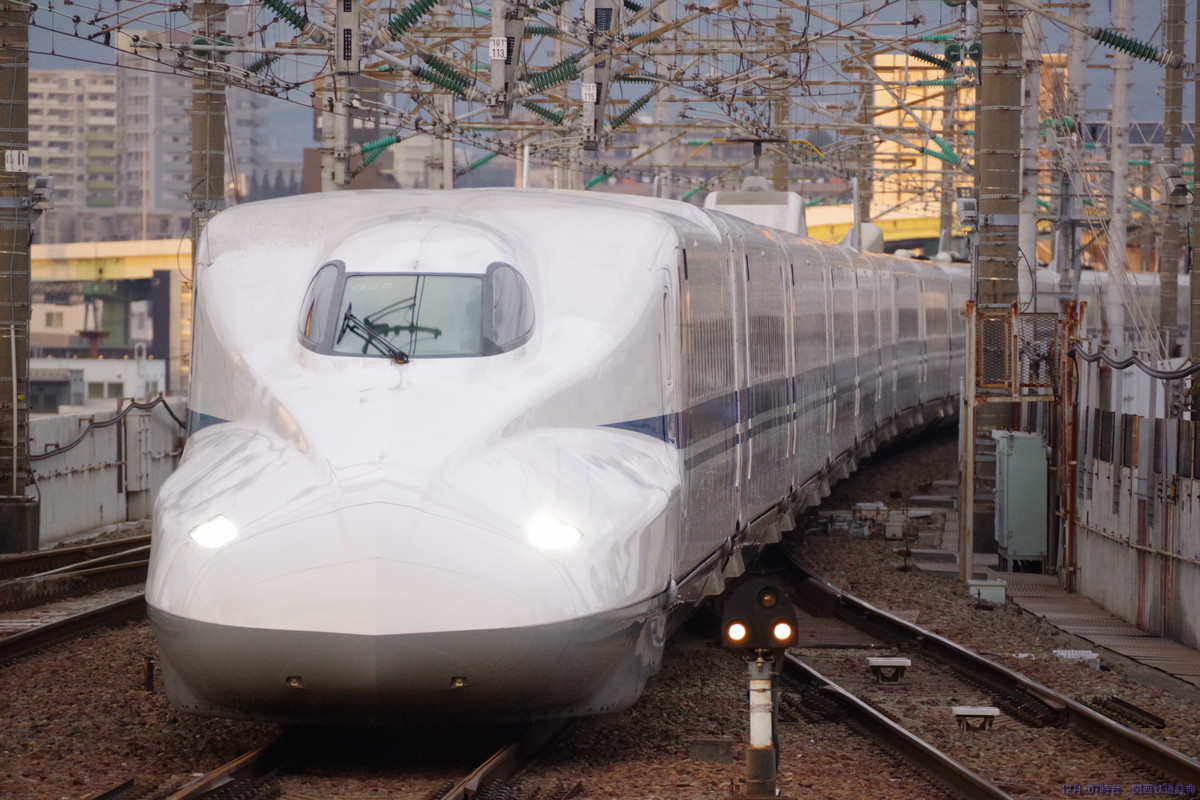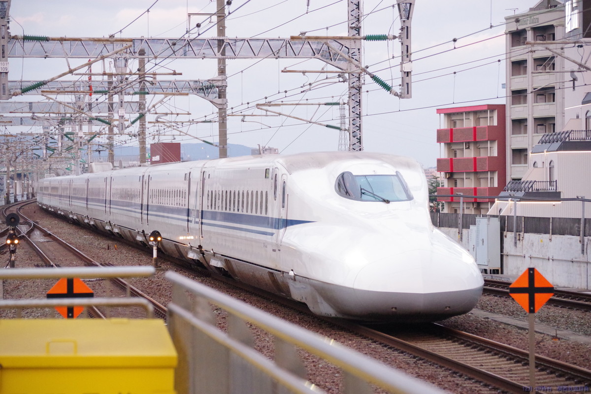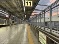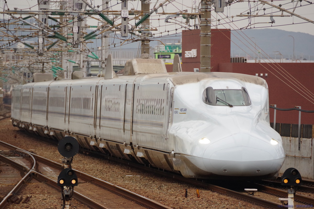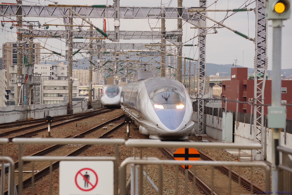 上りホームからの下り列車撮影。上り方は新関門トンネルに向かうため、逆サイドよりも大きなカーブになっています。またホーム端は詰所で先が見えず。ただホームがカーブしているので、15-14号車付近であれば、12番線に入る8両編成なら望遠でなんとか。ただ300mmではホーム柵をかわしきれず、少し入ってしまっています。