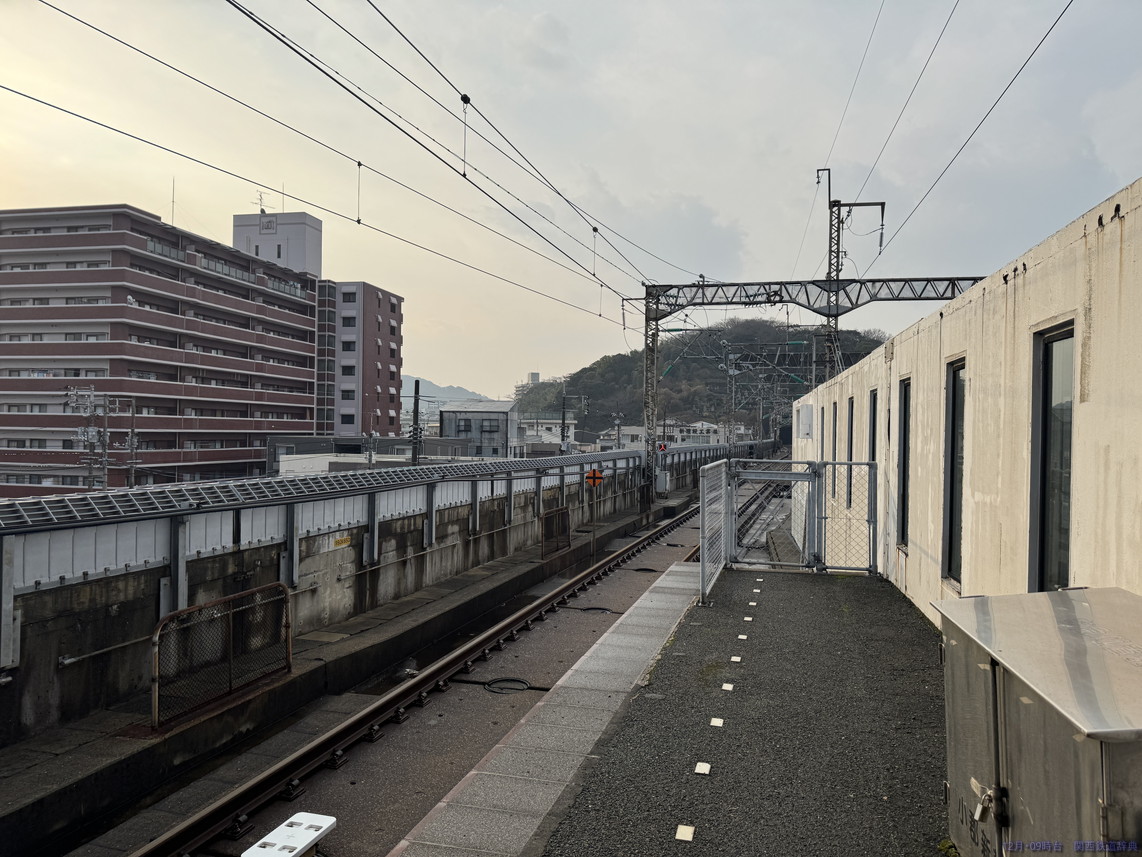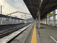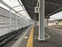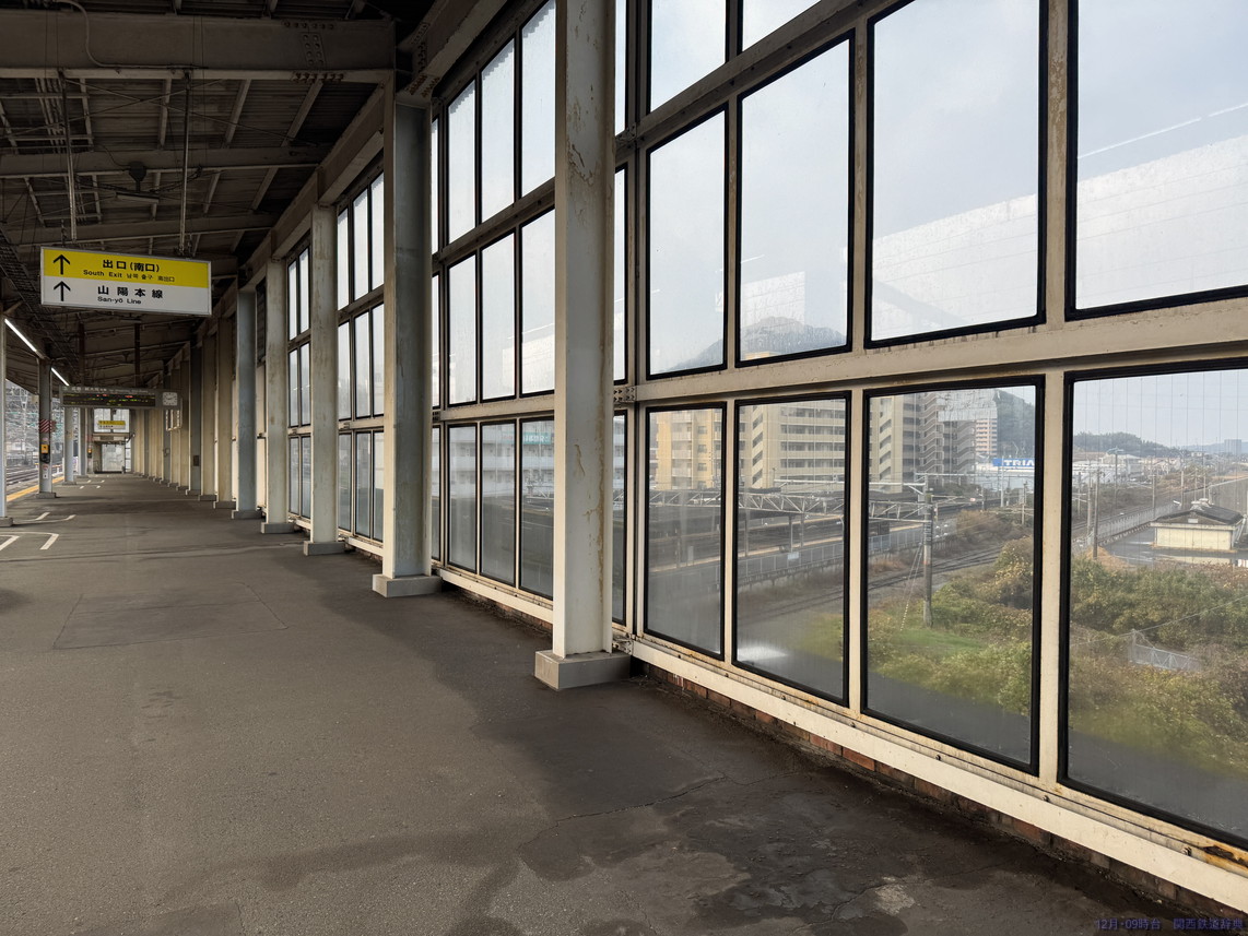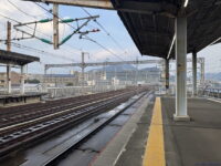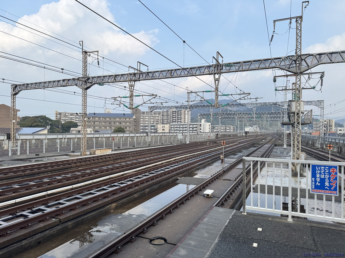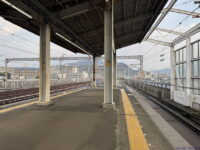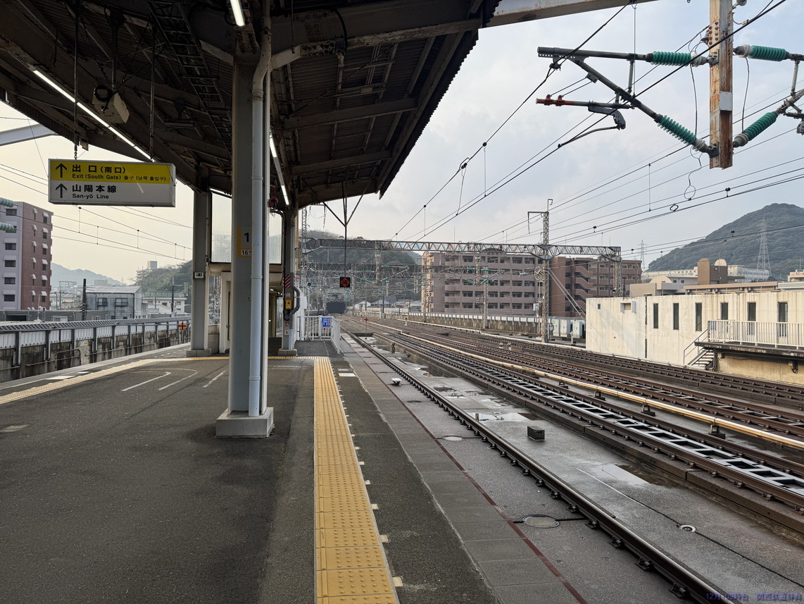 単式ホームの上り線からの撮影。厳密には島式構造で、一番外側は山陰新幹線用だそうですが、高架があるのは道路や橋の上など一部だけで、ホーム端も壁になっています。