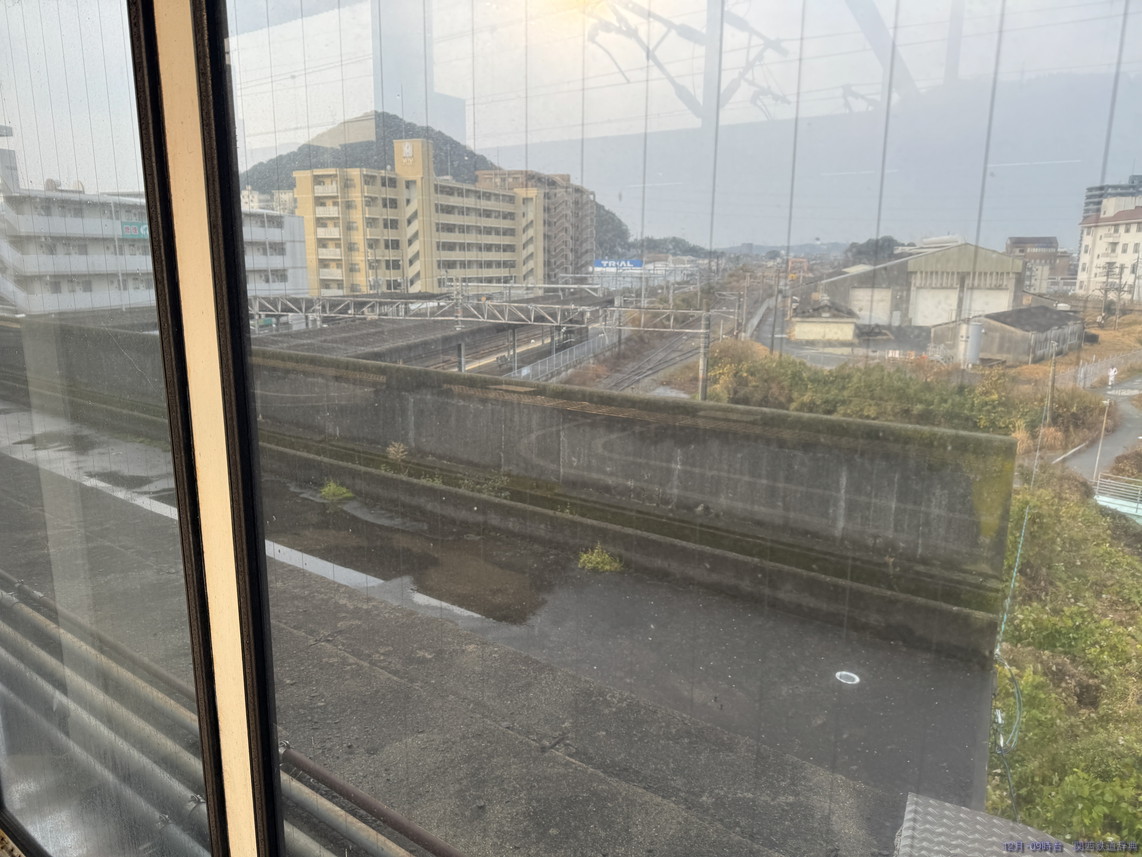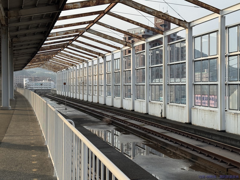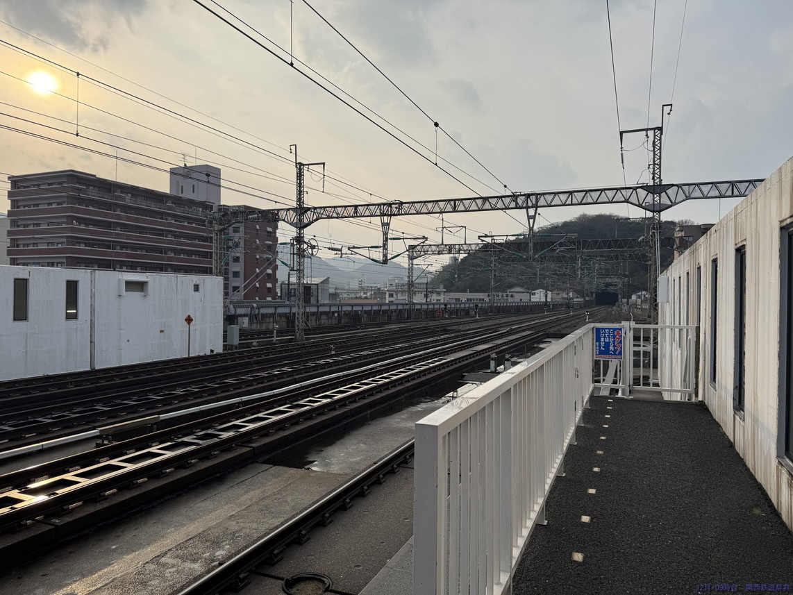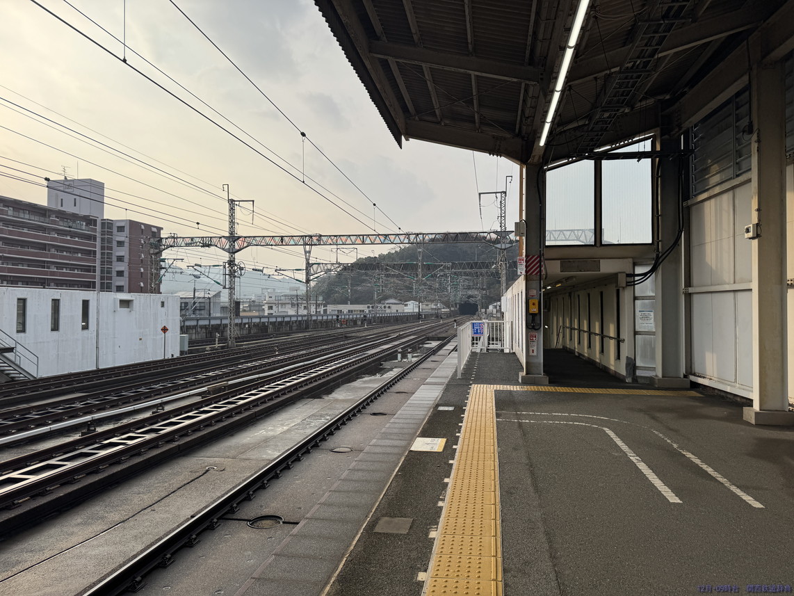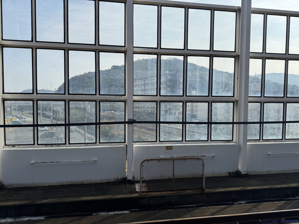 単式ホームの上り線からの撮影。厳密には島式構造で、一番外側は山陰新幹線用だそうですが、高架があるのは道路や橋の上など一部だけで、ホーム端も壁になっています。