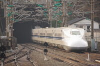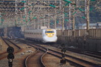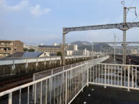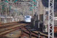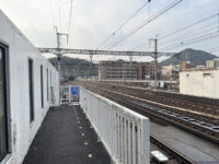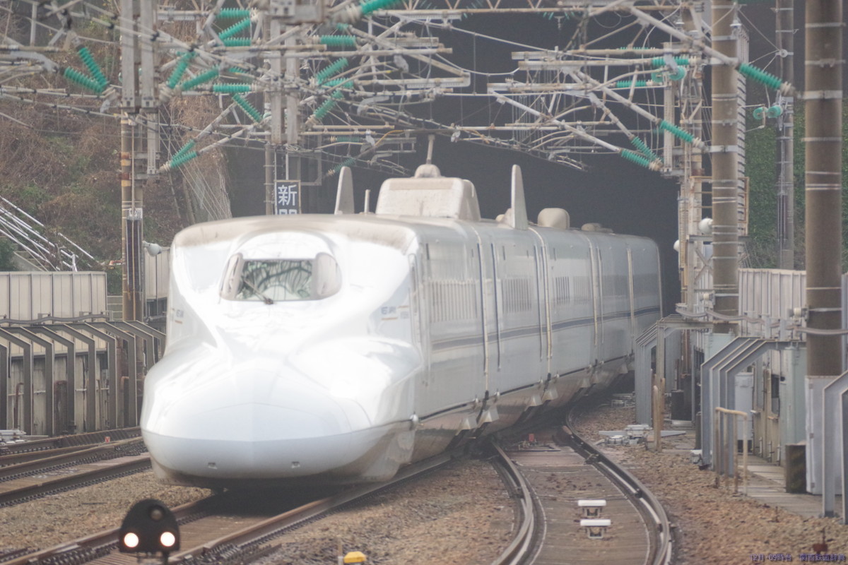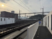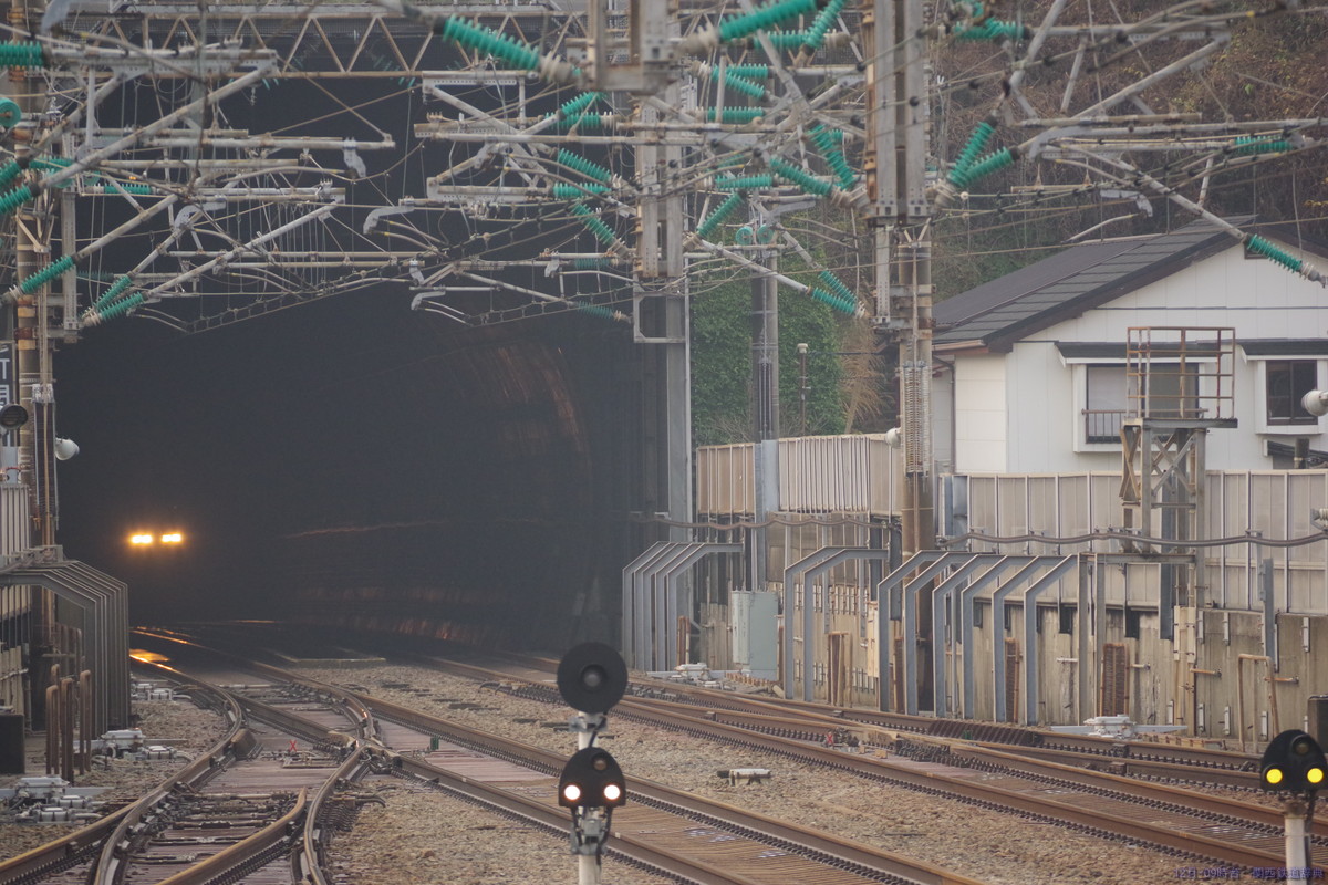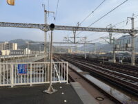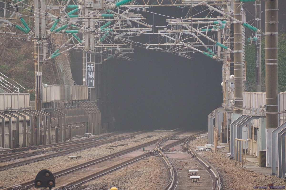 駅の下り方は、通過線とホームの線路が合流するすぐ先に新関門トンネルの坑口があり、下りホームからの上り列車撮影についてはトンネルから出てきたところになります。