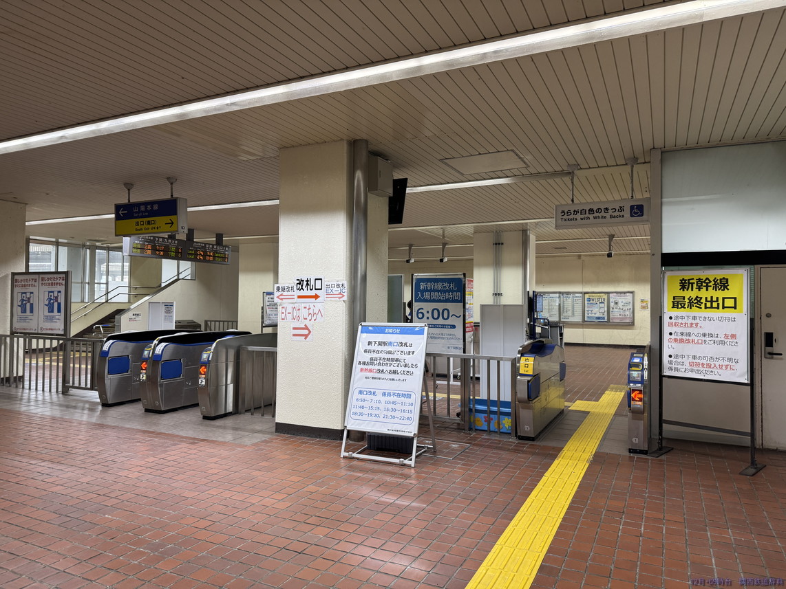 ・備考:この駅、南口があるのと南口と中央の新幹線口との間に川や道路があるせいか、新幹線口の階段は他の駅よりも後ろに寄っており、9号車と12号車付近にあります。