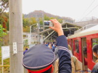 列車が信貴山口につくと、信貴山口4号踏切にいた撮影者たちが、アコーディオンカーテンのように広がって撮影。到着したところを撮りたいのは成る程、でしたが余りにスムーズに展開したので思わず吹き出しました。