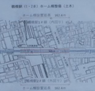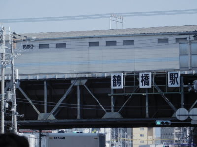 2019年11月15日に鶴橋駅に出現した工事用の囲い。柵で仕切られた未使用部分にあるため、立ち入れる部分から肉眼やスマホの望遠で見ても何が書いてあるのかわかりませんでした。そこで翌日、望遠付きコンデジを持ち込んで見たらば、やはり!